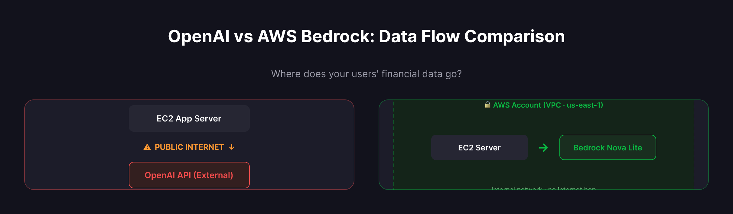 With OpenAI, your users' financial data β income, expenses, tax details, investment portfolios β travels over the public internet to OpenAI's servers. Yes, they have a data processing agreement. Yes, they say they don't train on API data. But try explaining that to a compliance team.